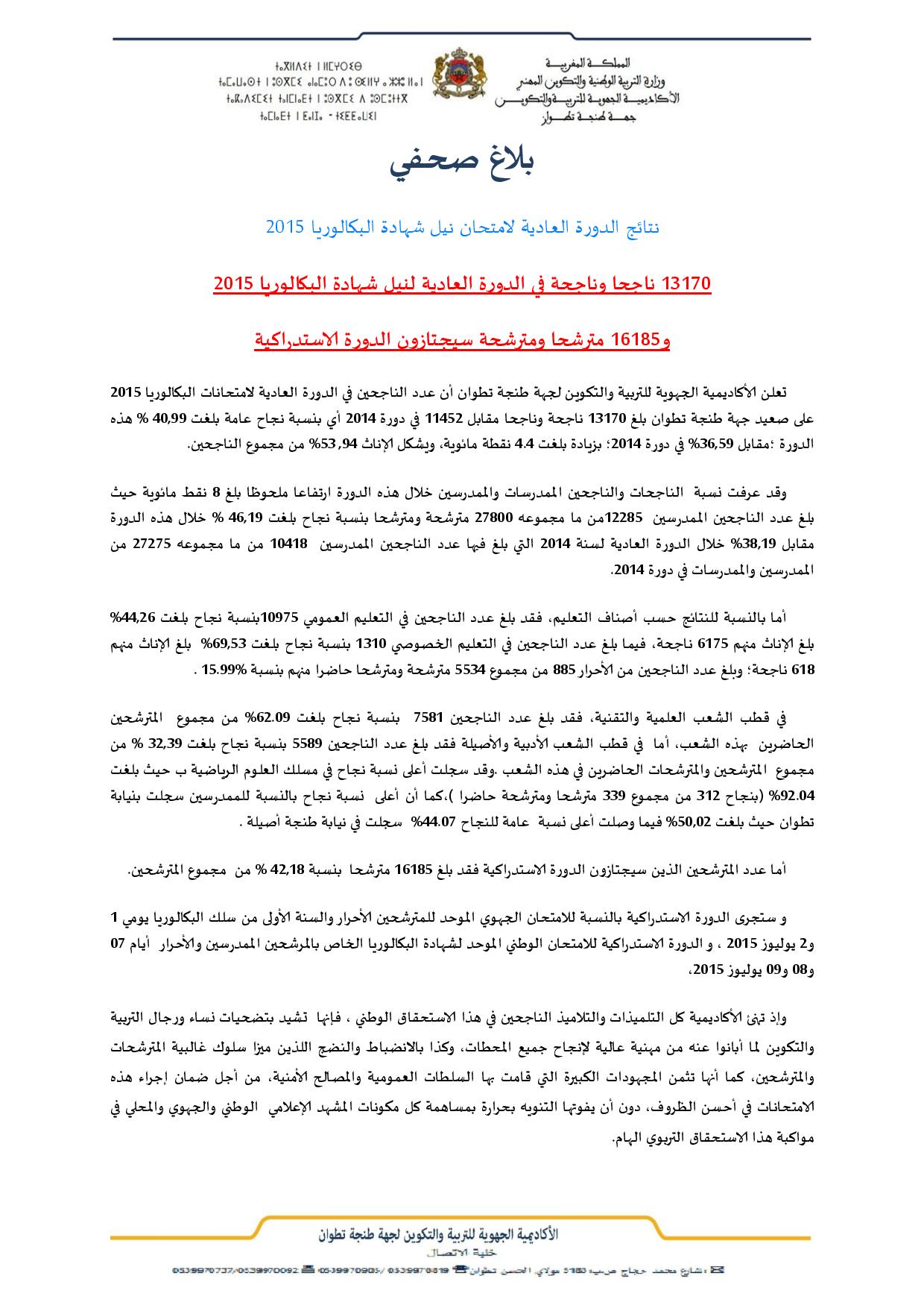 نتائج الدورة العادية لامتحان نيل شهادة البكالوريا 2015 بجهة طنجة تطوان -بلاغ‏